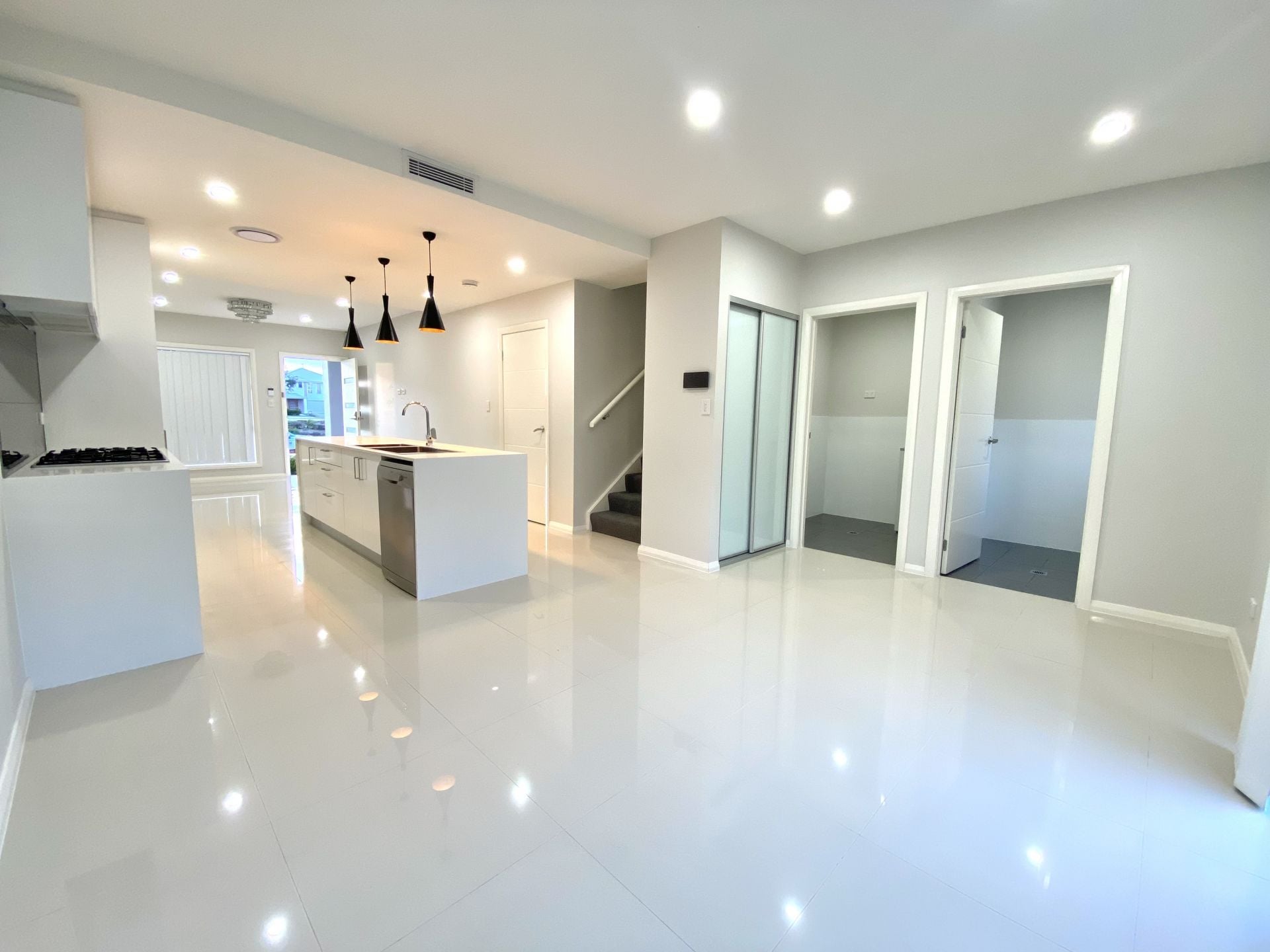 - Tiles to downstairs living areas with downlights throughout