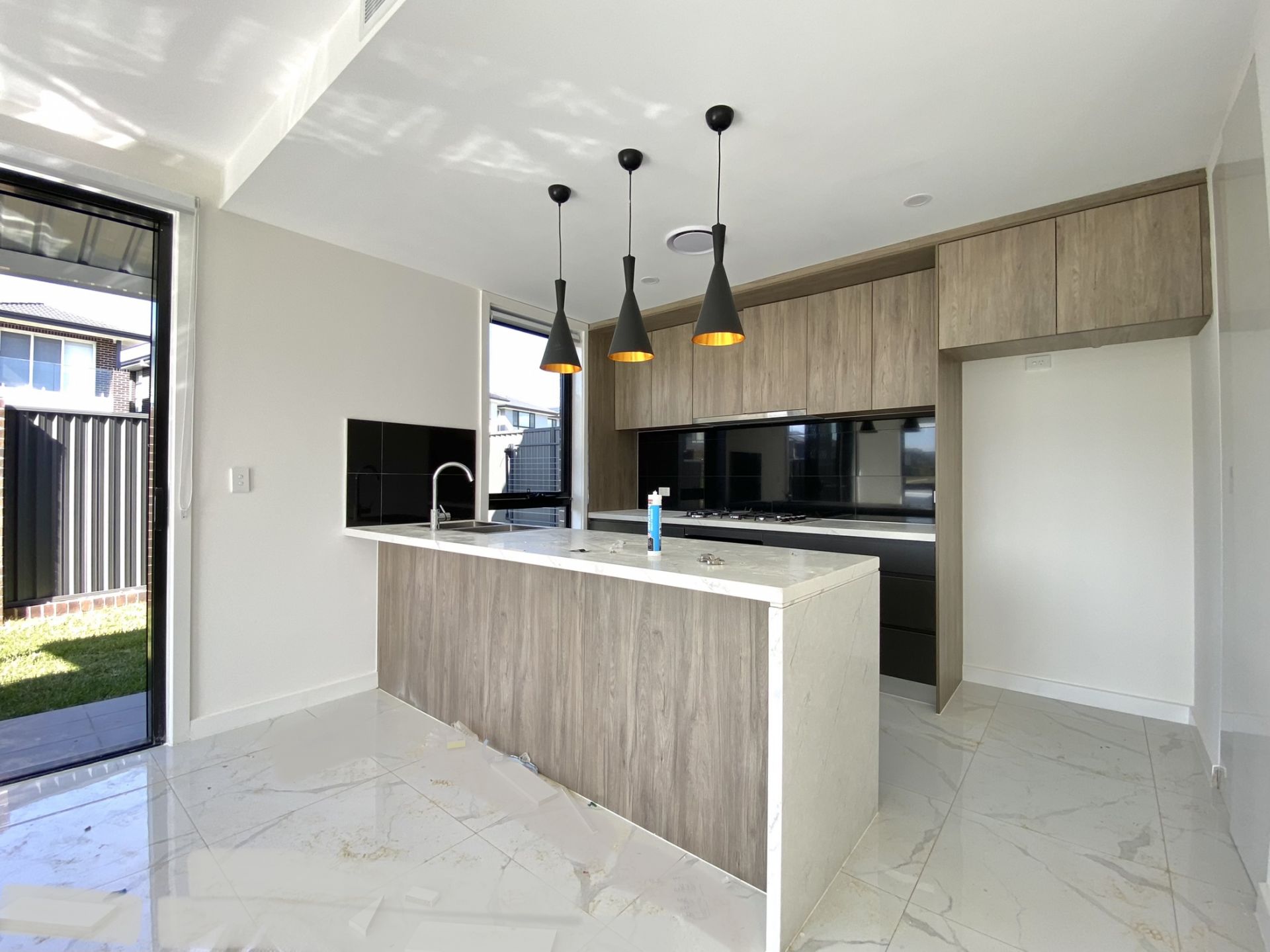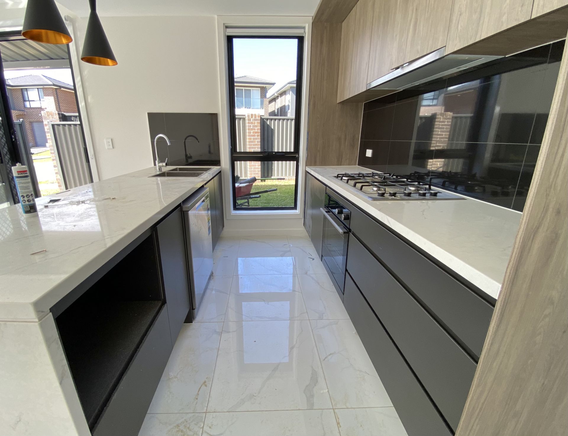 - Stone benchtop with gas cooking, oven, and dishwasher