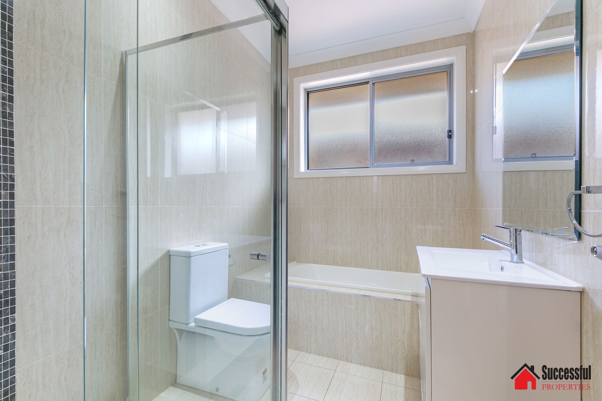 - Stylish main bathroom featuring floor to ceiling tiles, shower and bathtub