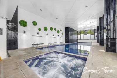 Residents enjoy resort-style facilities including an indoor heated pool, fully equipped gym, sauna, BBQ area, two secure side-by-side car spaces, and a dedicated on-site building manager.