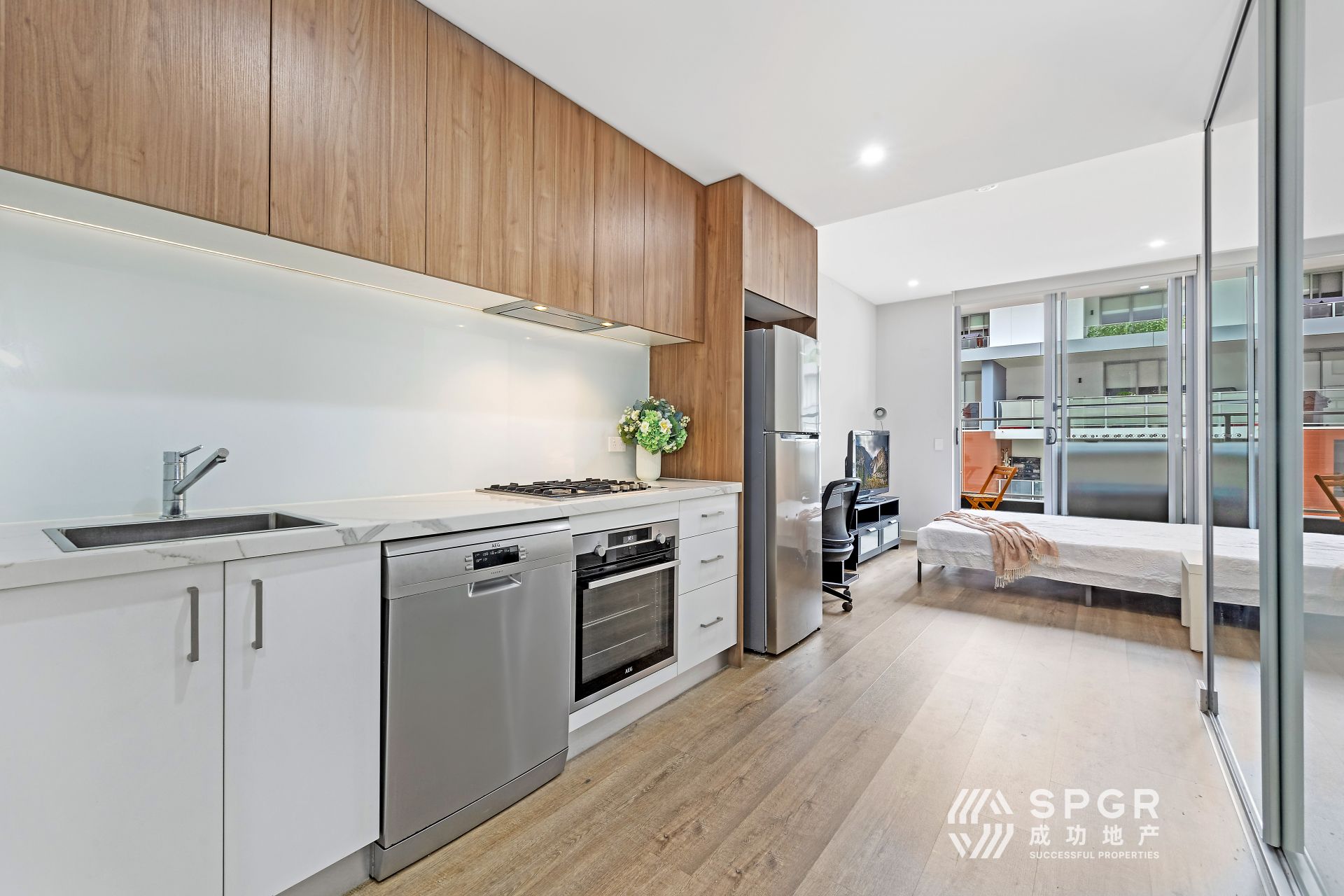 - Modern kitchen – Outfitted with premium AEG appliances, a sleek 400mm benchtop and gas cooking.
